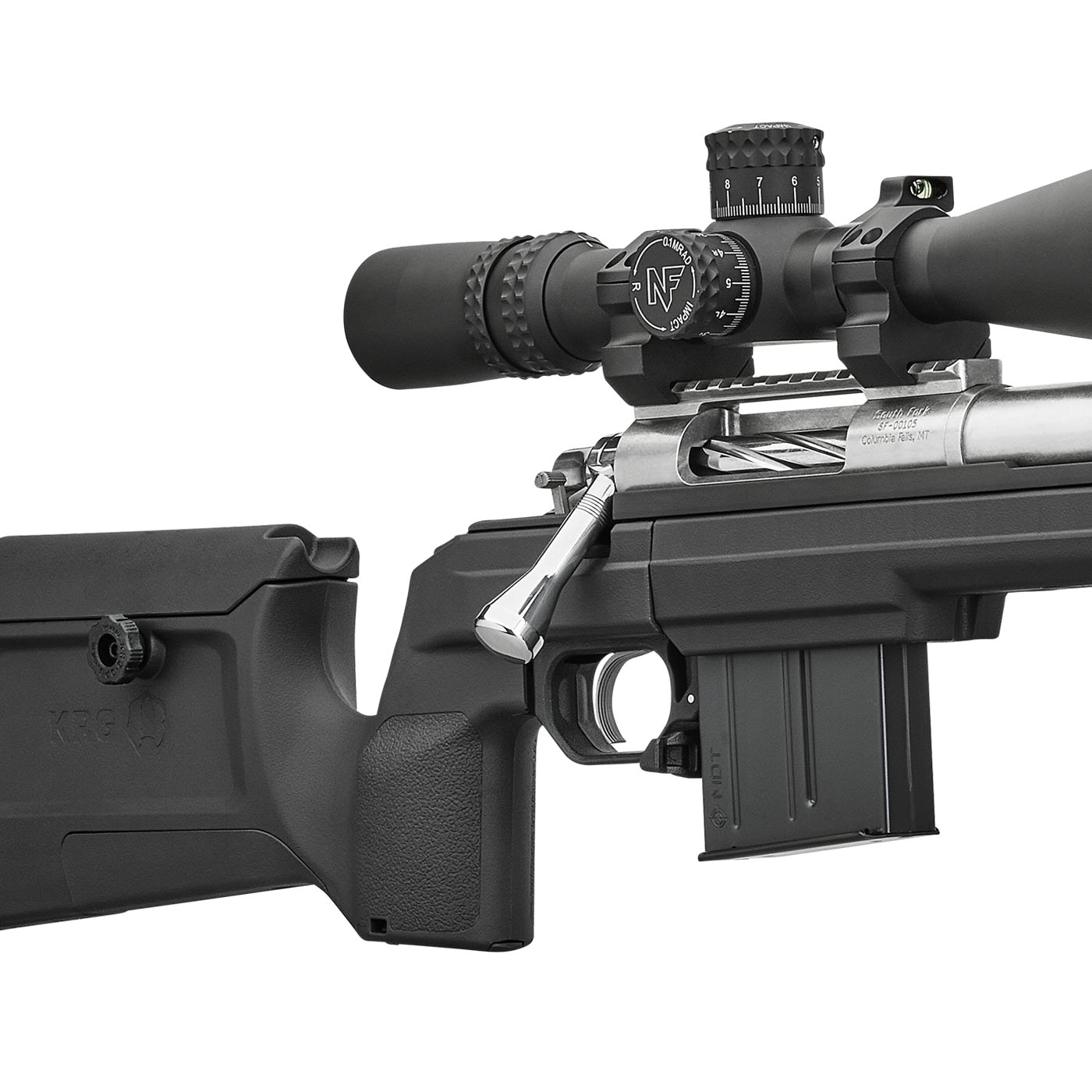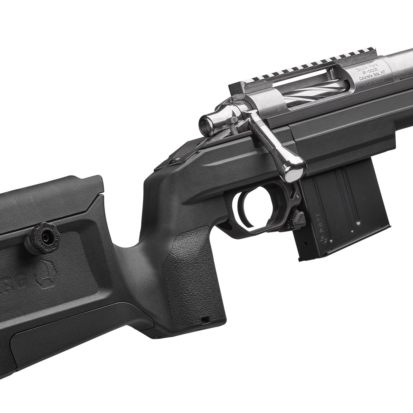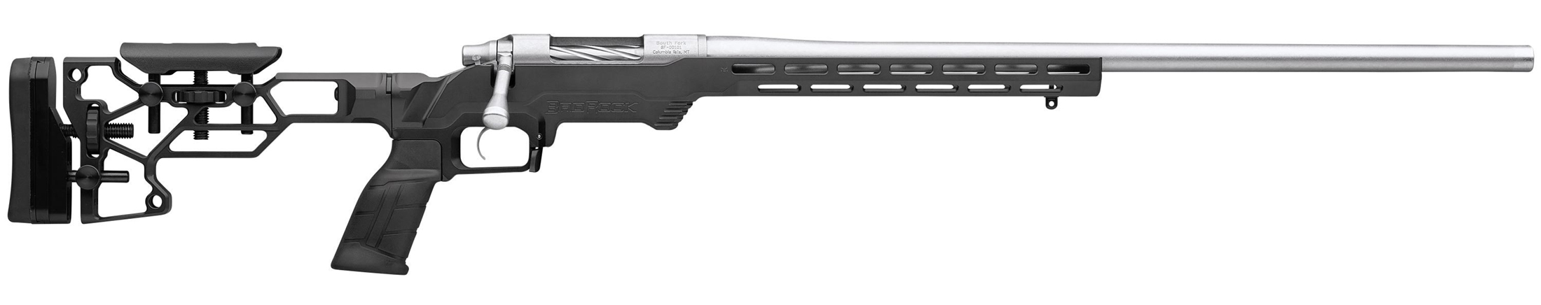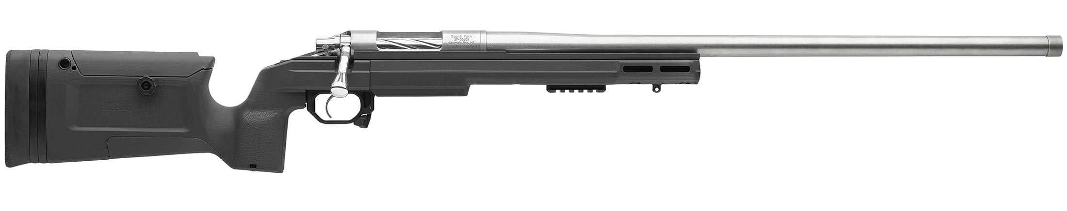 The South Fork model uses a precision bolt action, set into one of two chassis, with a premium stainless-steel barrel and TriggerTech trigger. The action is designed for a pinned, screw-on scope rail and pinned recoil lug. The South Fork has more adaptability for add-ons, without sacrificing durability or strength.
